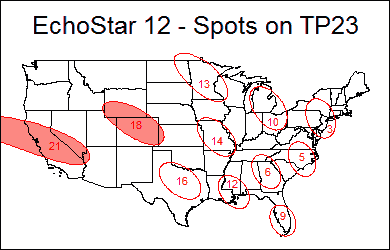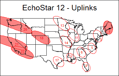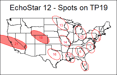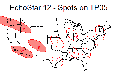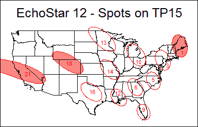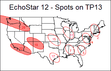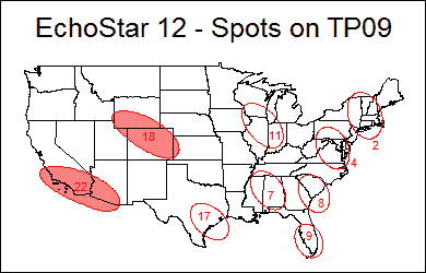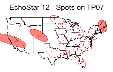 Spot beam coverage of Echostar 12 (formerly Rainbow 1) at 61.5°. Launched 07-17-2003 by Cablevision dba Rainbow DBS for the Voom DBS service. |