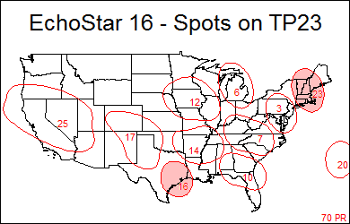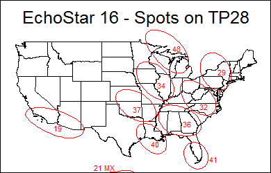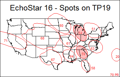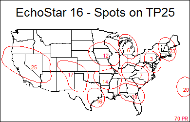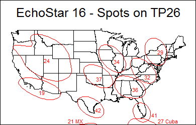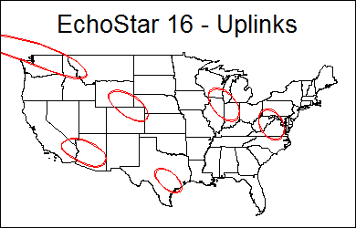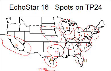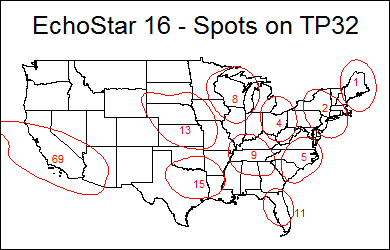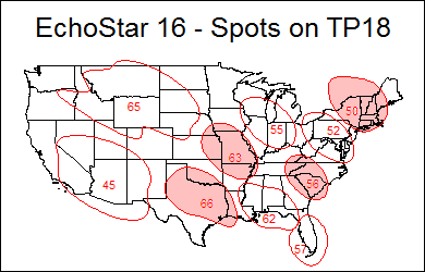 Spot beam coverage of Echostar 16 at 61.5°. Launched November 20, 2012 - Active January 15th, 2013. |