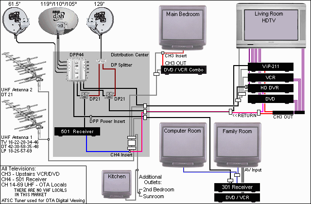 This was my wiring plan as of January 2006 ... note the HD DVR in the diagram, which is a ViP-622. I was still waiting for the '622 when I completed this drawing. Since then I have added the Dish1000+, which is not in this diagram. I set the DPP44 inputs as 119°, 110, 61.5° and 129°. The DP21s on my 501 and ViP-211 added 118° to the mix. At the time of this drawing my locals were on 105° ... they have now moved to a spotbeam on 119° after it was vacated by channel moves to 110°. The second UHF antenna was been removed from the system since during the summer and daytime trees and distance block reception of DT21. |